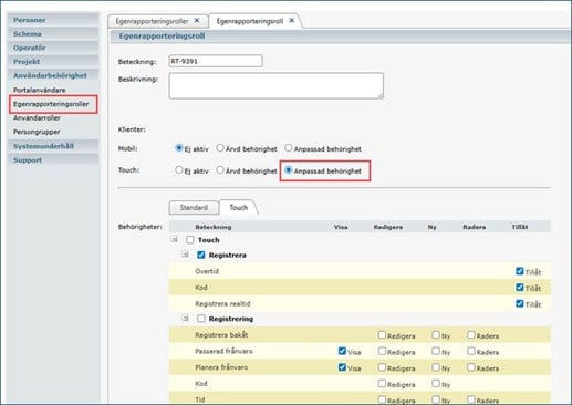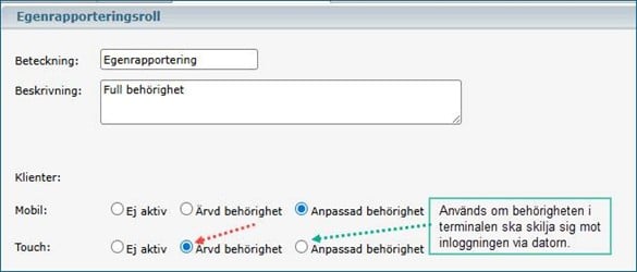 Om ni önskar att behörigheten via terminalen skall skilja sig mot Egenrapporteringsrollen väljer ni istället Anpassad behörighet och väljer önskad behörighet.