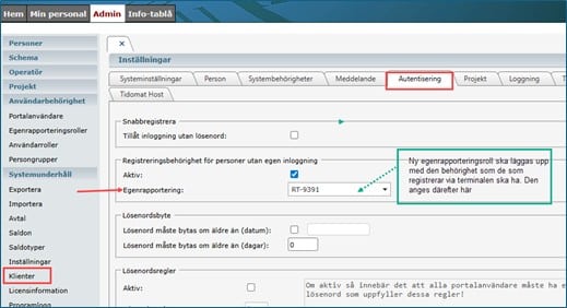 Därefter går ni till Systemunderhåll – Klienter – Autentisering här väljer ni den nya Egenrapporteringsrollen och sparar.